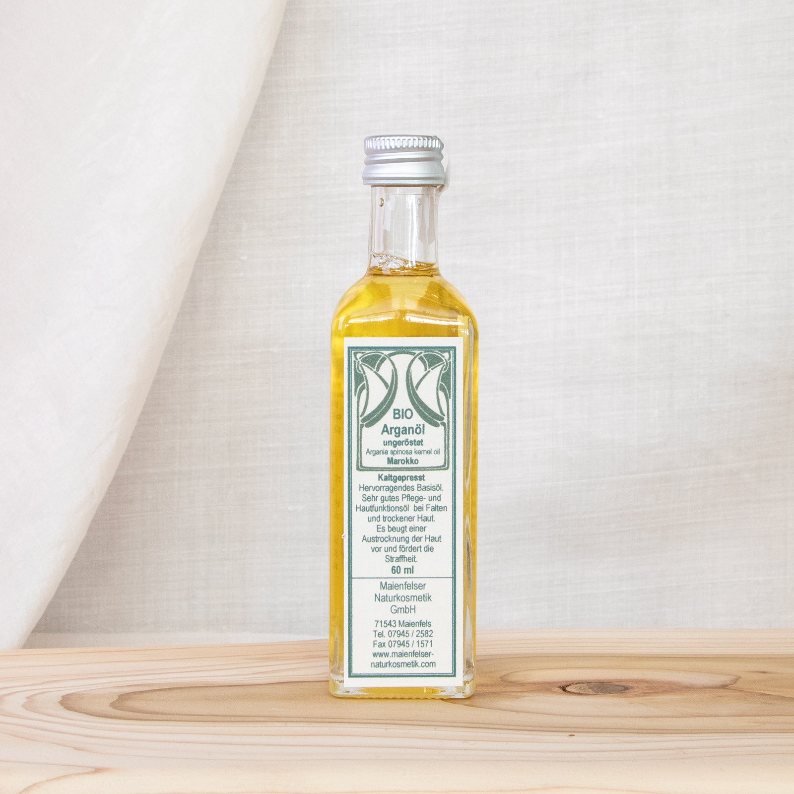 Der Arganbaum ist ein stacheliger Baum mit sehr langen Wurzeln, der ausschließlich in Süd-West-Marokko in den Wüstengebieten zwischen Essasouira und Agadir wächst. In den heruntergefallenen, gelben, etwa pflaumengroßen Früchten befinden sich die kleinen kirschkerngroßen Nüsse, aus denen das Öl gepresst wird. Die traditionelle Gewinnungsmethode ist sehr aufwändig und mühevoll. Die Nüsse werden mit Steinen aus ihren Schalen befreit, getrocknet, leicht angeröstet und in den traditionellen Steinmühlen gemahlen. Das daraus entstandene Nussmehl wird mit Wasser unter stetigem Kneten zu einem Teig vermengt, aus dem dann tröpfchenweise das kostbare Öl austritt. Diese braune ölige Emulsion wird dekantiert, so dass ein klares orange-gelbes Öl entsteht.