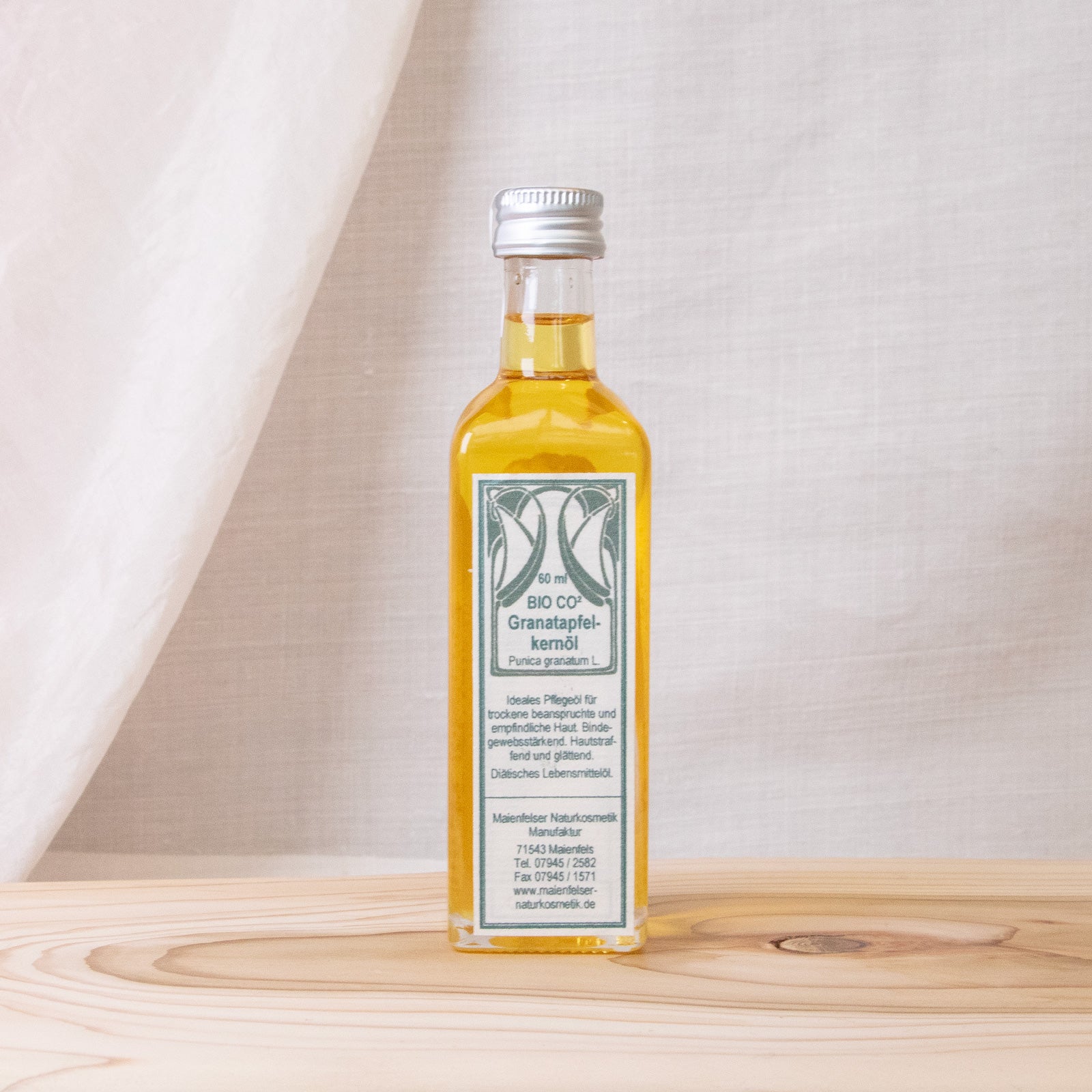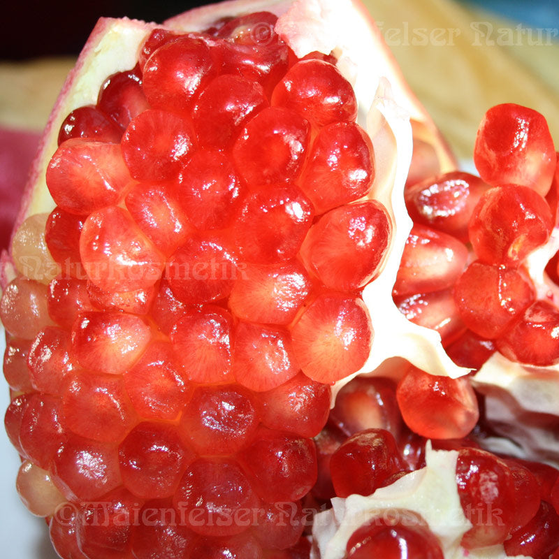 Der Granatapfelbaum kommt ursprünglich vor allem im südwestlichen Asien von der Türkei über den Iran, Syrien bis nach Indien vor. Heute sieht man ihn auch rund ums Mittelmeer. Die rote Frucht des Granatapfels beinhaltet zahlreiche erbsengrosse Samen mit roter Aussenschicht, die entweder kaltgepresst oder in CO2-Extraktion ein sehr wertvolles Öl ergeben. Das hellgelbe Öl hat einen lieblichen, leicht süßen Duft. Durch den hohen Anteil einer ungewöhnlich seltenen Ölsäure - der Pumicinsäure, die zu den mehrfach ungesättigten Fettsäuren (Omega 5) gezählt wird - zeigt das Granatapfelkernöl eine starke antioxidative Eigenschaft.