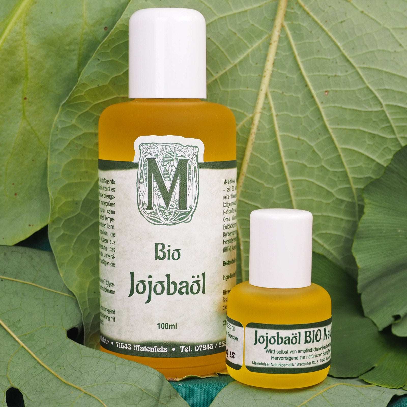 Die hervorragende hautpflegende Eigenschaft des Jojobaöls sind es wert, näher auf diese Pflanze einzugehen. Jojoba ist ein immergrüner Wüstenstrauch, der durch seine langen Pfahlwurzeln selbst Temperaturen bis 60º C überstehen kann. Nach der Blüte entstehen die Fruchtkapseln mit den Nüssen, aus denen durch Kaltpressung das Jojobaöl gewonnen wird. Forschungsergebnisse bestätigen die überlieferten Aussagen der Indianer über die große hautpflegende Wirkung des Öls. Das Jojobaöl ist bis zu 20 Jahre haltbar, da es keine Triglyceride (Fette) enthält, sondern eine Reihe hochmolekularer Esterketten mit Carbonsäuren (flüssigem Wachs). Weiterhin enthält das Jojobaöl das wichtige Hautvitamin E in natürlicher Form, Mineralstoffe und sonstige natürliche Nähr- und Hautpflegestoffe.