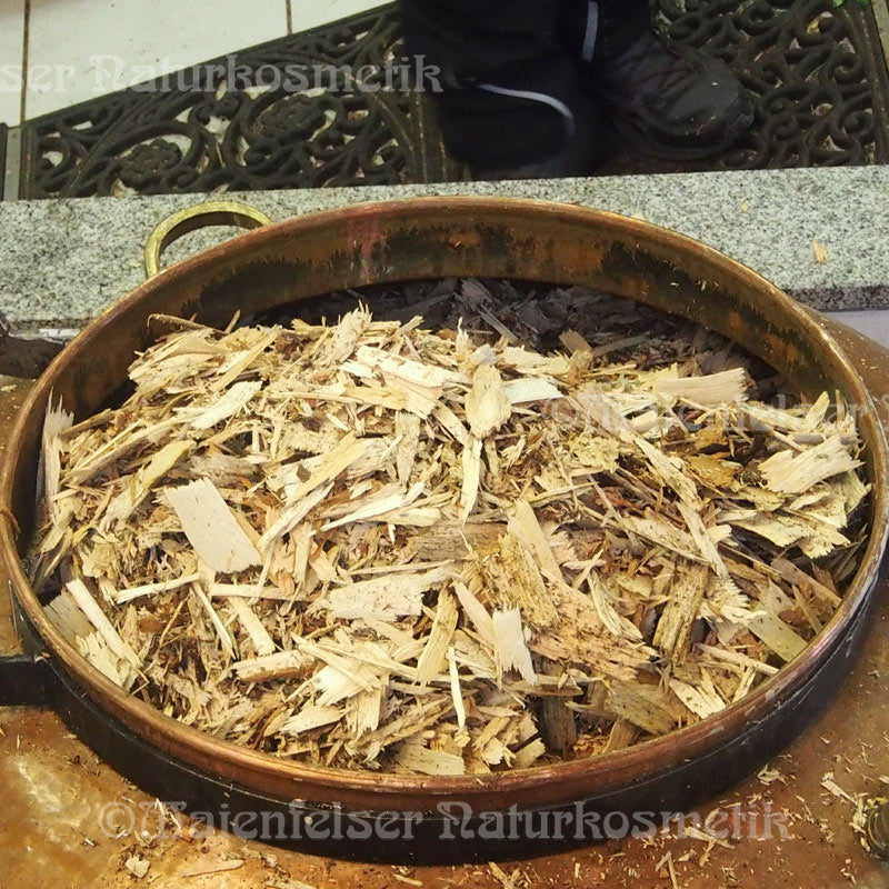 Das Holz kommt von Südtirol aus über 2000m Höhe. Bei uns wird es geschreddert und nur die Zirbelspäne werden destilliert.
