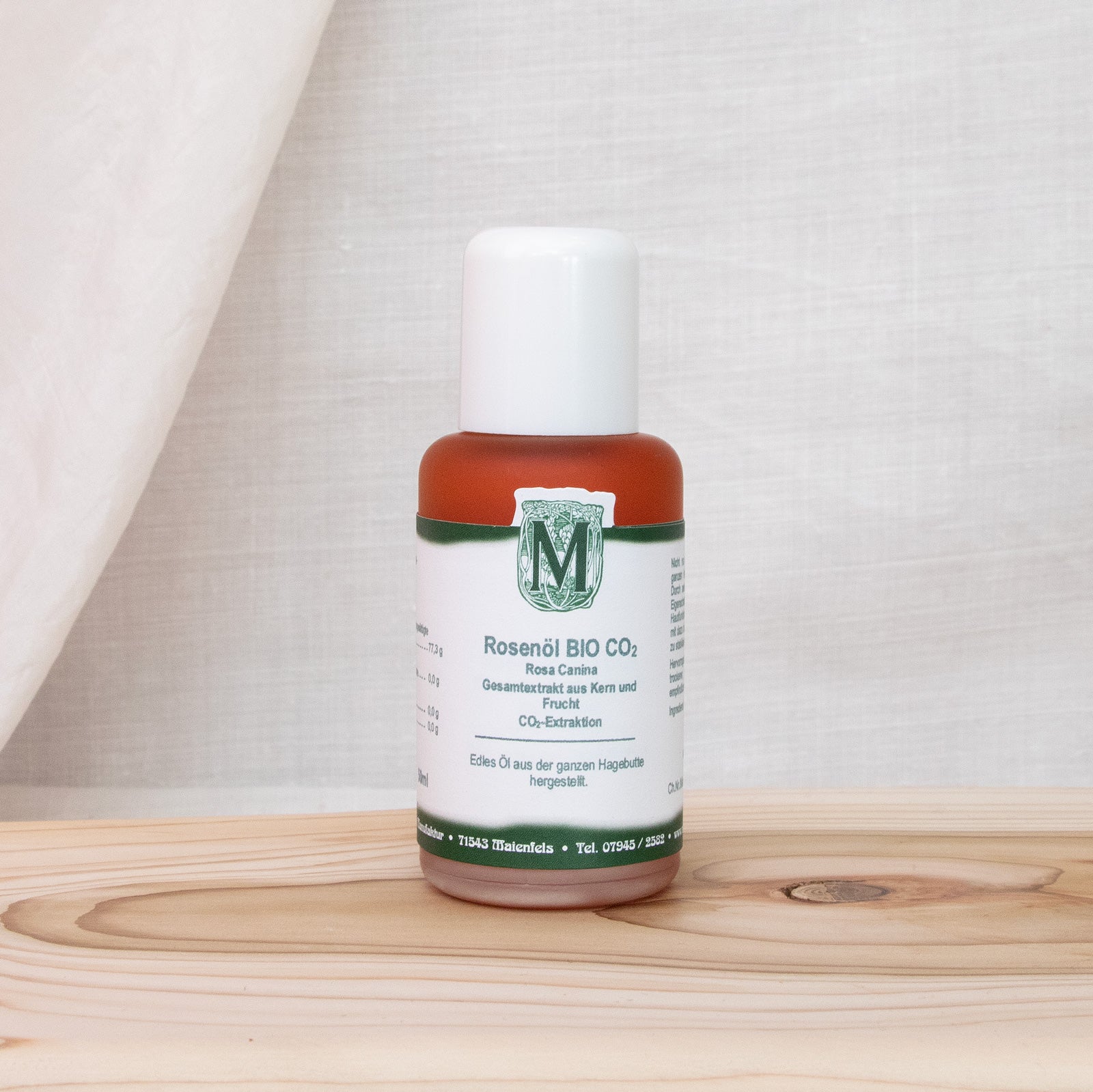 Hier wird die ganze Hagebutte extrahiert, nicht nur der Kern. Durch den hohen Anteil der Carotine in den Schalen ergibt dies ein orange-rotes Öl. Hier kann man die Ölsäure-Unterschiede, auch zu den gepressten, vergleichen.