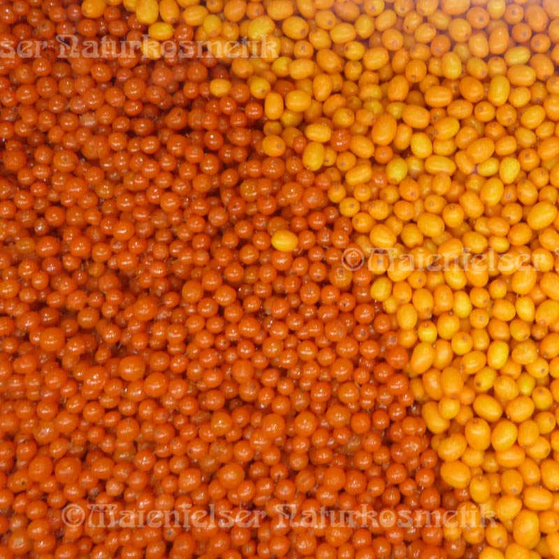 Kosmetische Verwendung: Sanddornkernöl hat bei weitem nicht so viel Carotinoide und ist dadurch in der Farbe mehr gelb. Seine hohen Werte an ungesättigten Fettsäuren, allen voraus die Alpha-Linolensäure, machen es zu einem idealen, leicht verträglichen wertvollen Hautpflegeöl für jeden Hauttyp mit angenehmem Hautgefühl.
